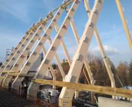 Tak powstawała konstrukcja drewnianego szkieletu naszego przyszłego kościoła. Zamocowano na drewnianym szkielecie membranę dachową i kontrłaty. Ekipa murarska natomiast wyprowadza coraz wyżej ściany szczytowej prezbiterium i podwyższa boczne mury. ” order_by=”sortorder” order_direction=”ASC” returns=”included” maximum_entity_count=”500″]